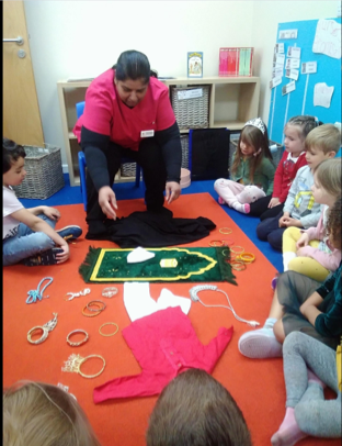 Akhter kindly brought her precious prayer mat and jewellery in for preschool to explore and try on.